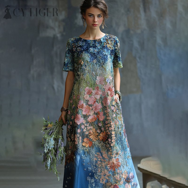 Women's Oil Painting Floral Contrast Color Sequined Maxi Dress