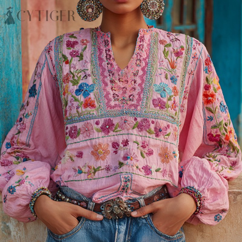 Women's Retro Ethnic Pink Awareness Flower Embroidery Printed Top