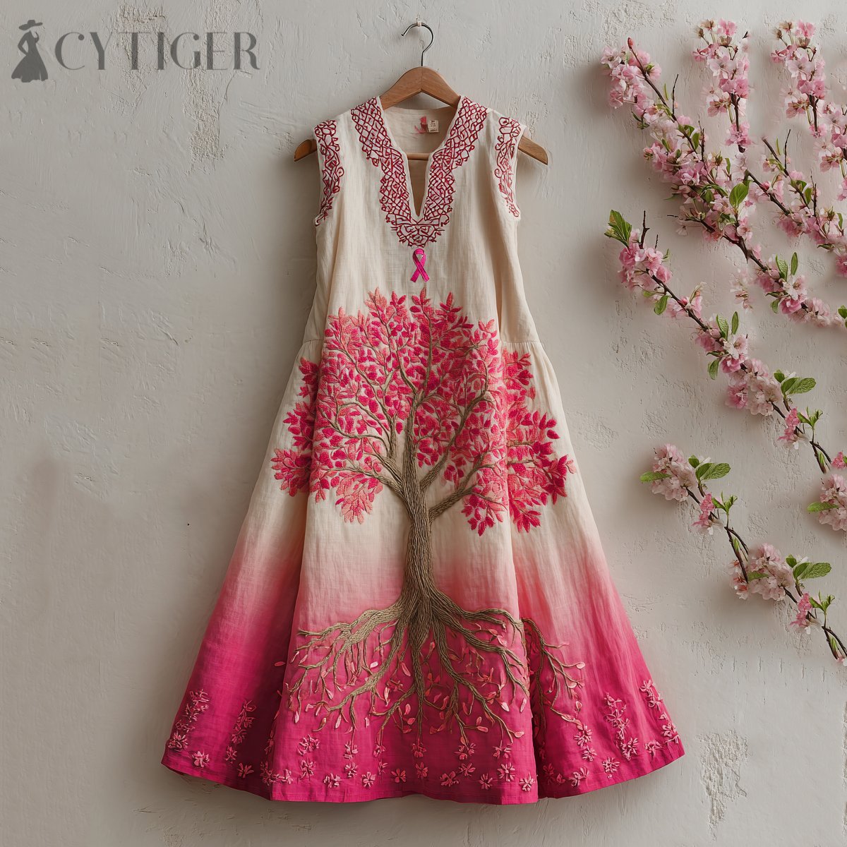 Women's Tree Of Life Pink Ribbon Embroidery Tank Maxi Dress