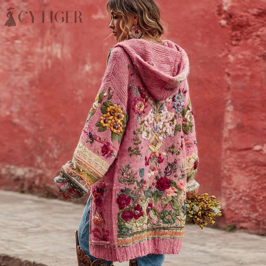 Women's Vintage Bohemian Floral Embroidery Art Cozy Knit Hooded Sweater Cardigan