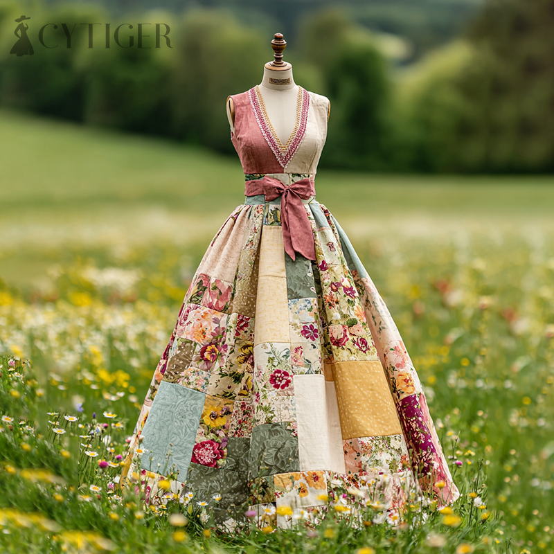 Women's Vintage Floral Patch V Neck Comfy Maxi Dress