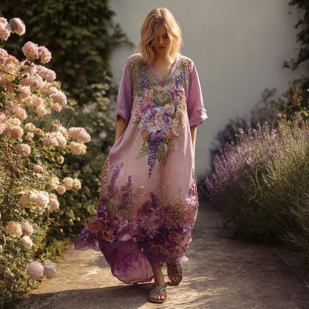 Women's Vintage Lupine And Floral Embroidery V-neck Long Sleeve Dress
