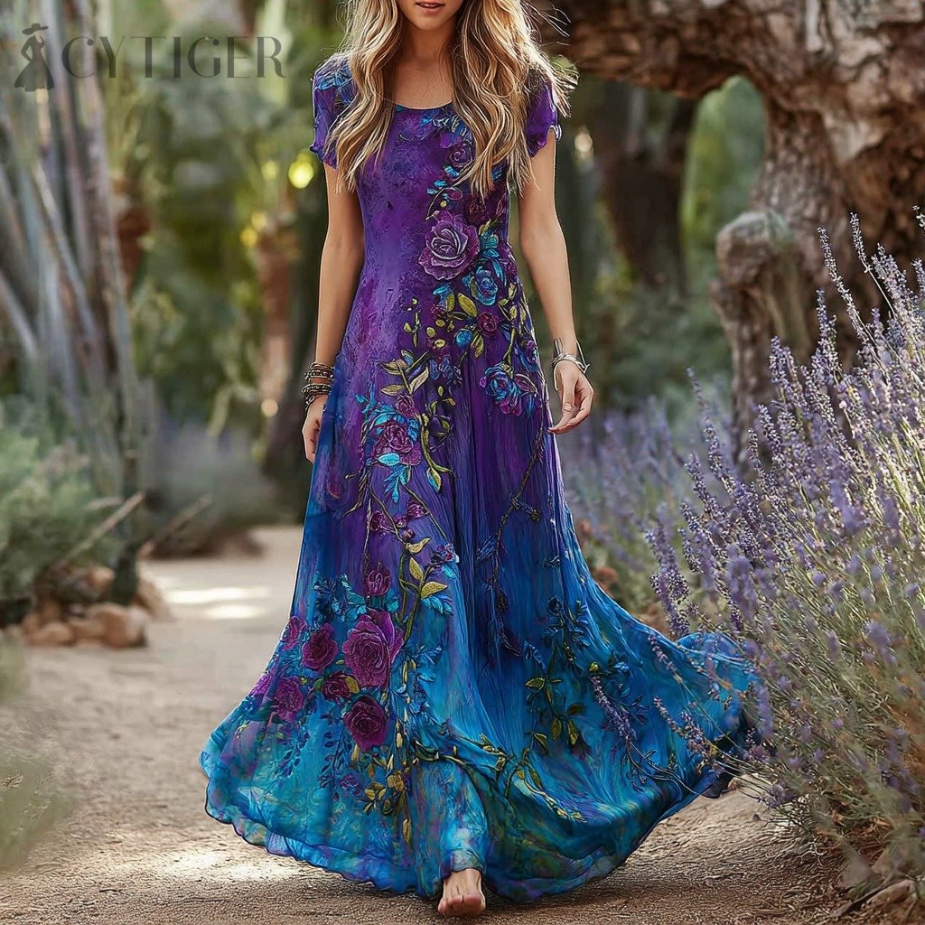 Women's Vintage Rose Floral Pattern Round Neck Short Sleeve Dress